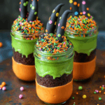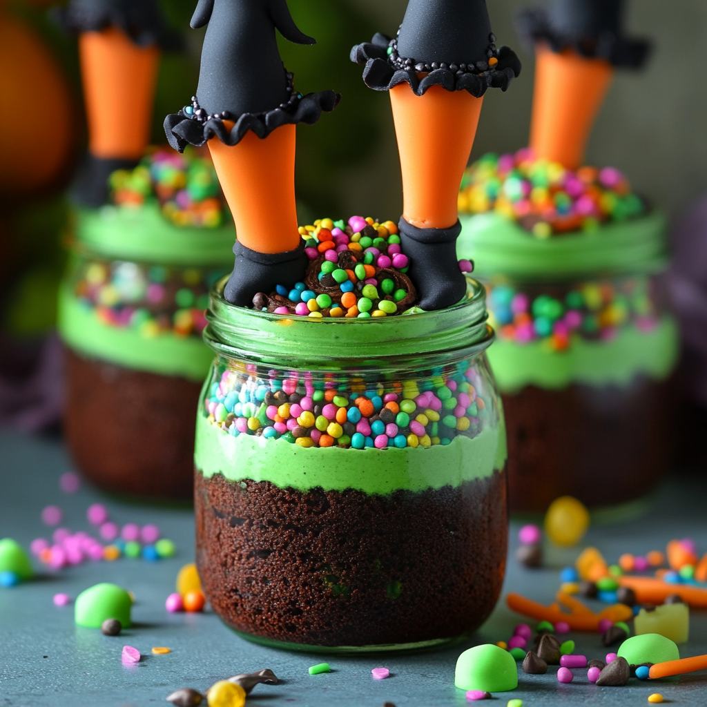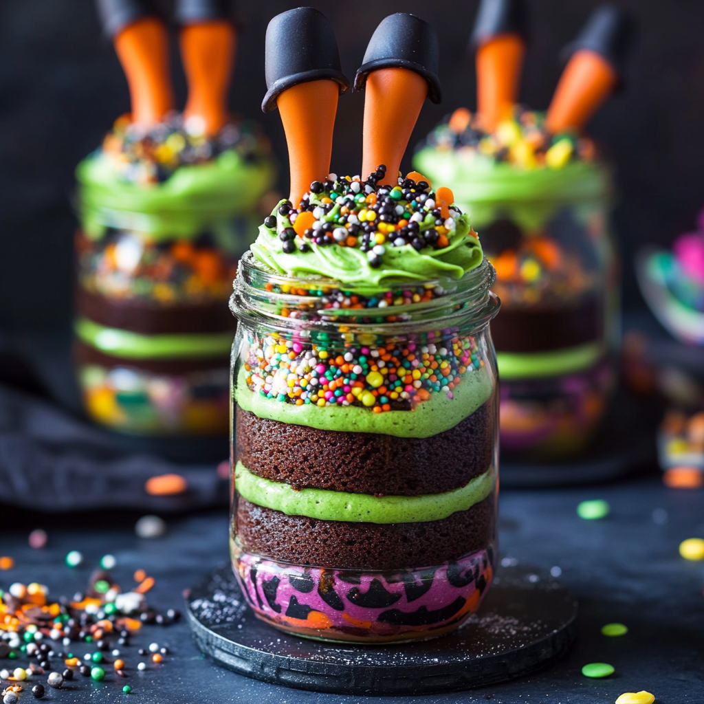 Get ready for Halloween fun with these Witches Brew Halloween Cake Jars! These delightful treats are perfect for spooky gatherings, parties, or just to enjoy at home. Each jar is filled with layers of rich chocolate cake and vibrant green buttercream, making them not only delicious but also visually stunning. The added sprinkles and cute fondant witch legs make these jars a standout dessert that will impress everyone.